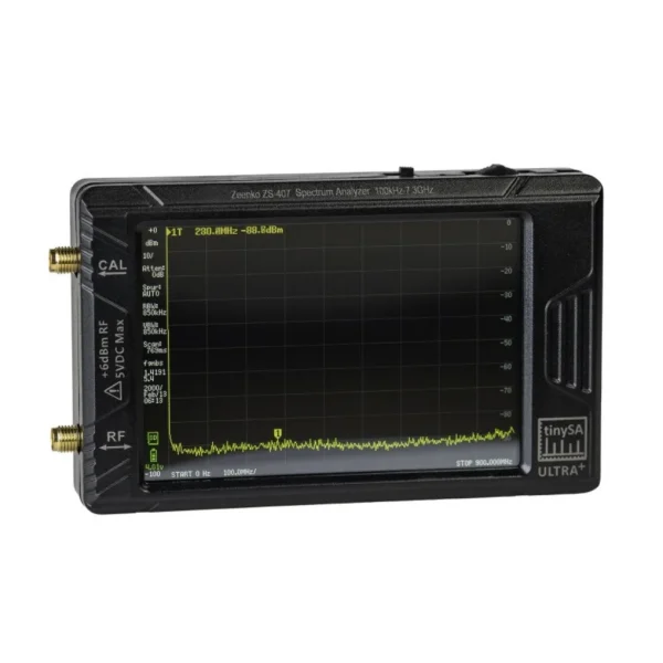 Прилад комплектується 4-дюймовим сенсорним кольоровим екраном з роздільною здатністю 450 точок сканування, що дозволяє відображати весь частотний спектр одночасно. TinySA підтримує два режими роботи – стандартний і ультра, має регульований смуговий фільтр та вбудований атенюатор з кроком налаштування.