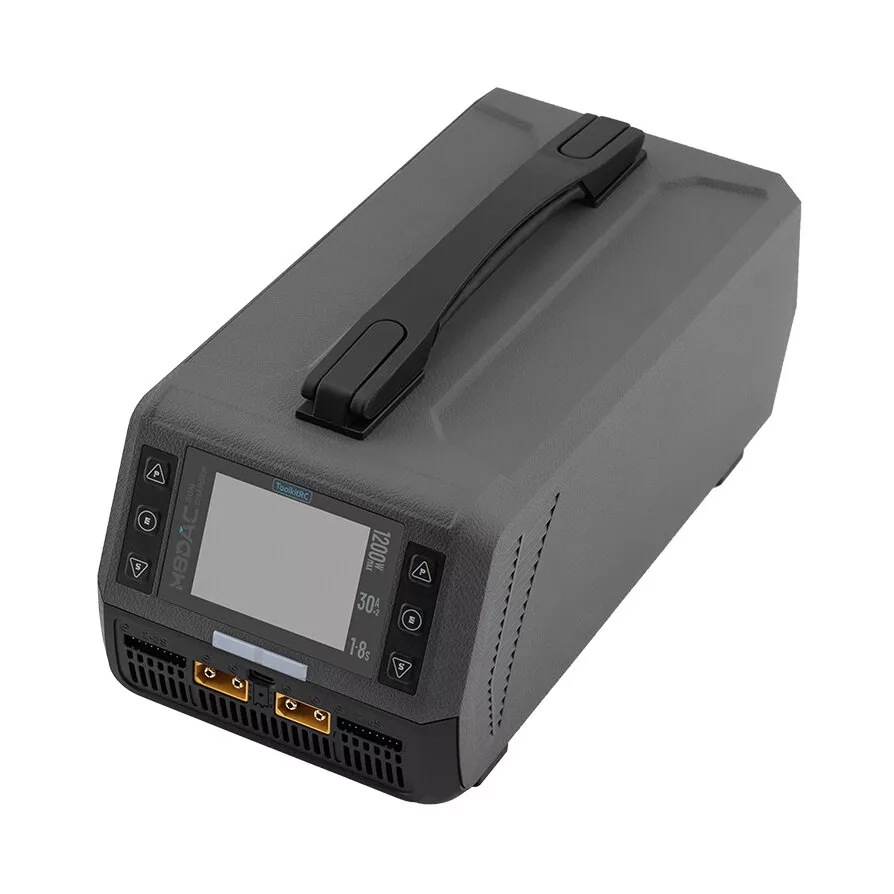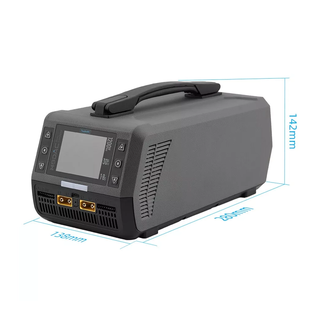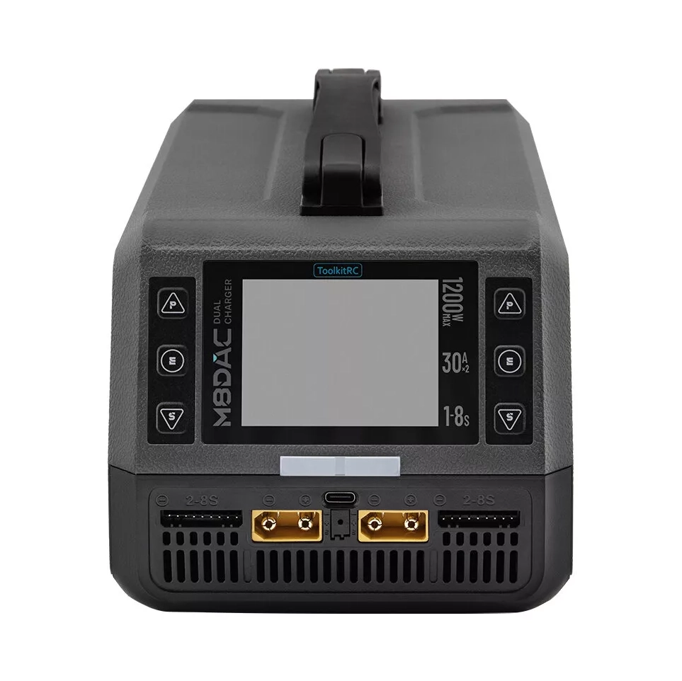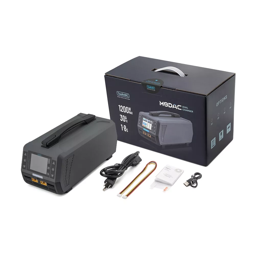 ToolkitRC M8DAC — двоканальний балансувальний зарядно-розрядний пристрій із вбудованим AC/DC джерелом живлення, орієнтований на акумулятори LiPo/LiHV 1–8S. Підтримує два режими роботи силової частини: двоканальний незалежний (асинхронний) режим із виділенням до 600 W та струмом до 30.0 A на кожен канал, або синхронний режим з об’єднанням каналів до 1200 W і струмом до 50.0 A на одному виході.